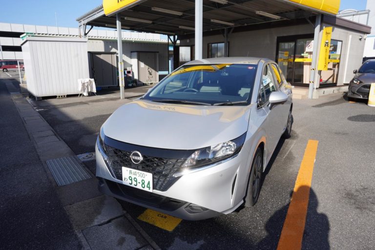 試験場前から歩いてタイムズのカーシェアに到着。今日はこちらのノートePowerに乗車します。山道などを走るときにはパワーが強いePowerだと快適です。