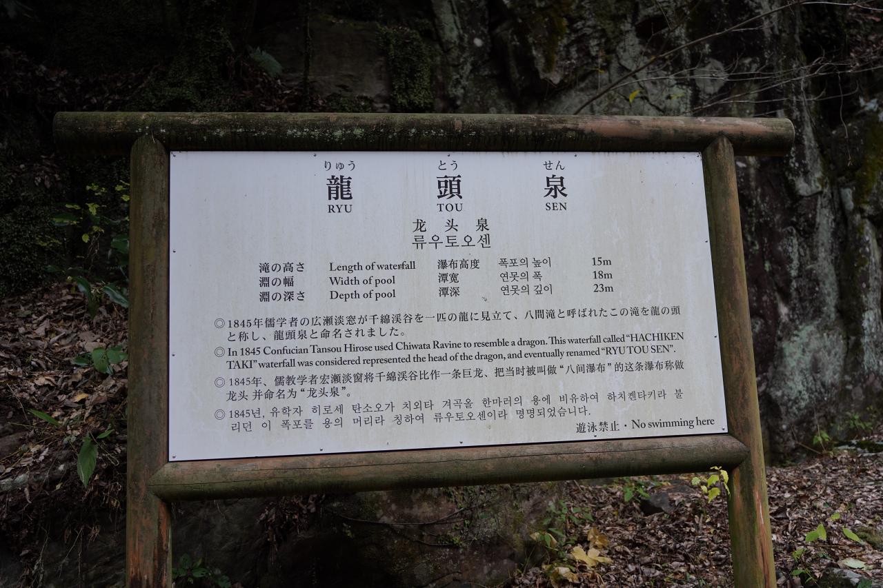 龍頭泉はもともと千綿渓谷を1本の龍にたとえたことが名前の由来だそうです。そしてこの下にある滝が龍の頭なんだとか。