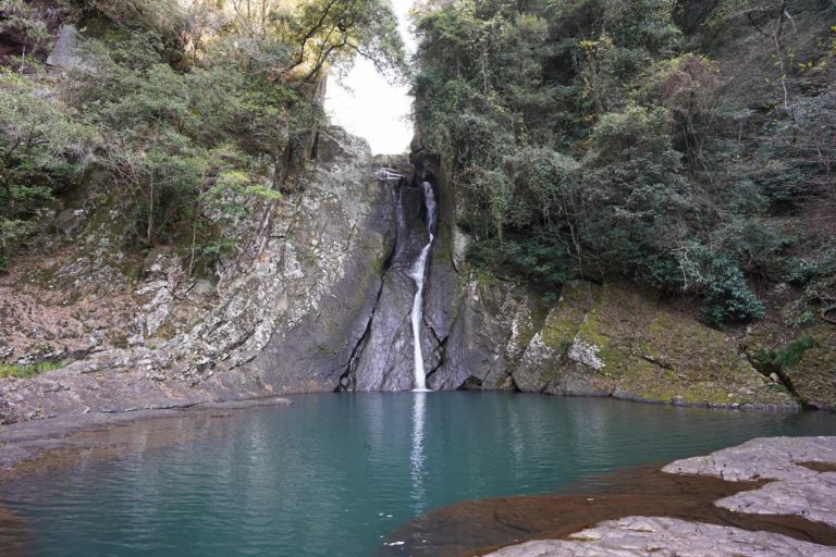 静かに流れ落ちる滝とエメラルドグリーンに染まった滝つぼ。めちゃくちゃきれいな水なので、夏とかは泳ぎたくなっちゃうかもしれないけども遊泳禁止だそうで……。なお滝の周辺の岩場は滑りやすいので足元注意。