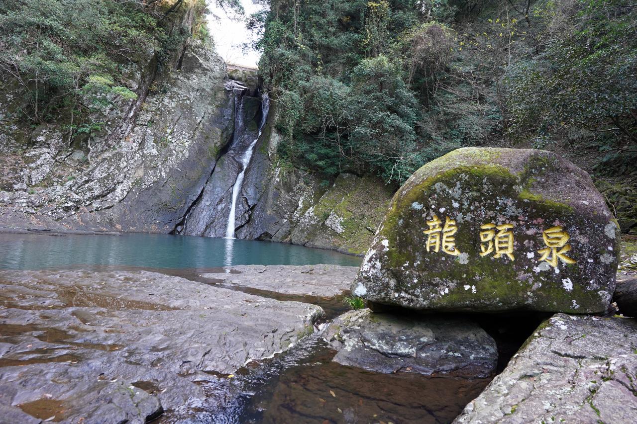 しばらく下ると川へと降りられます。すぐ前には滝つぼもあり、「龍頭泉」と書かれた石もありました。渓谷はここから始まるから龍の頭ってことなんですね。