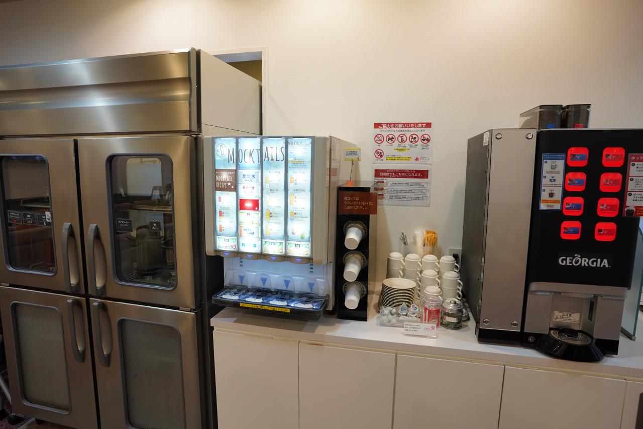 ドリンクコーナー。反対側にあるドリンクバーとは機械が異なり、単純に飲むだけなら押すボタンが少ないこっちのが楽。ブレンドしたいなら反対側の方が良いので、何が飲みたいかで使い分けると良いかも。
