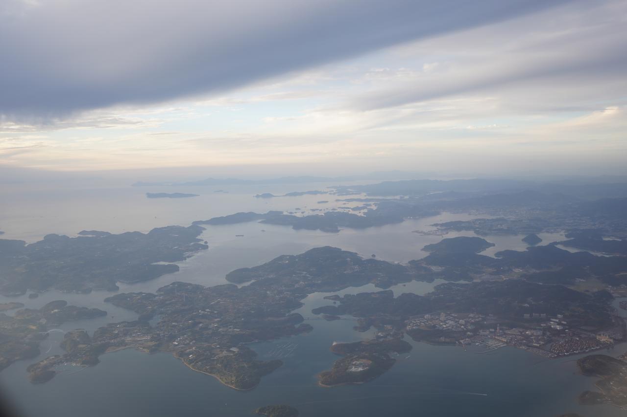 長崎県は離島の数が多いことでも有名で、上空からも大小さまざまな島を見ることができます。こういう島を巡る旅行とかもしてみたいんだよなぁ。
