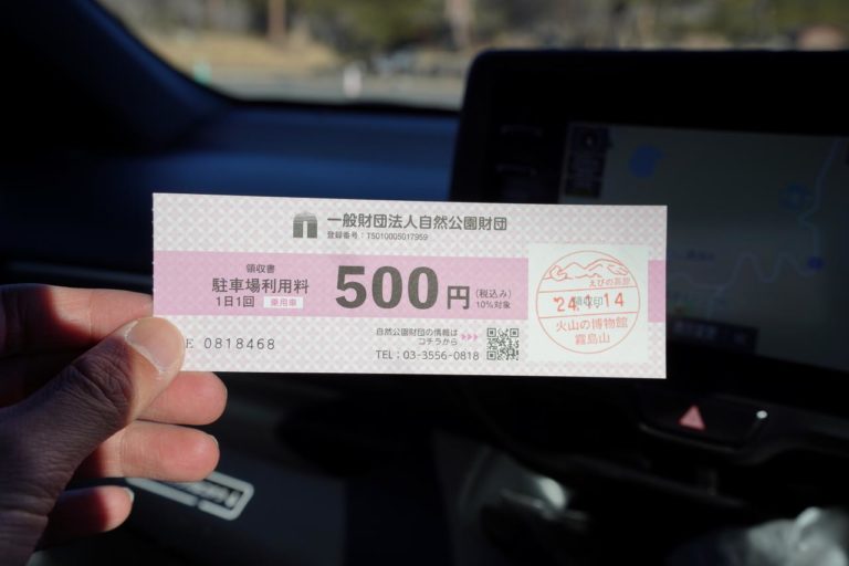 えびの高原の駐車場は1回500円の有料。なおトイレに行くだけとかなら足湯施設に無料で停めて中のトイレを使うことはできます。