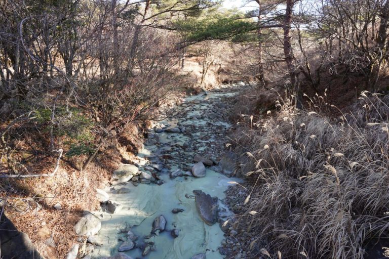 展望台方面に足を進めると、硫黄を含む水が流れる川が。近くの硫黄山からここまで流れてきているようです。