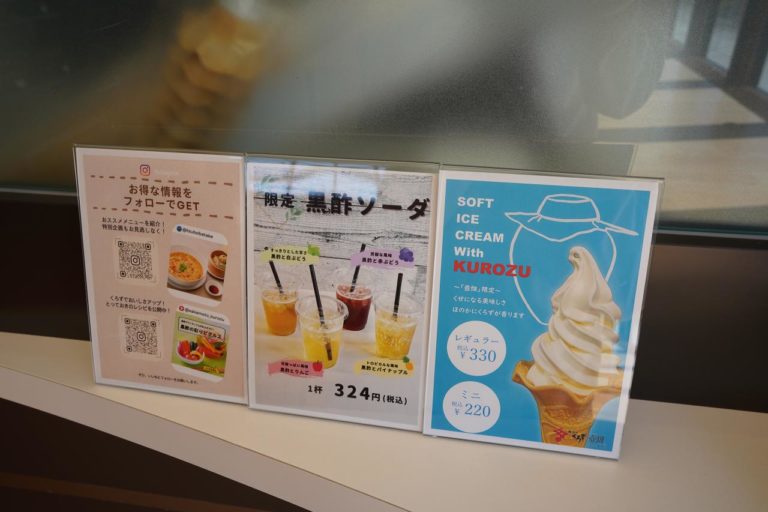 売店とレストランに分かれている建物の売店側では、黒酢ドリンクやソフトクリームが販売中。黒酢ソフトクリームってどんな味がするんだろうと気になったので食べてみることに。