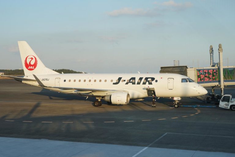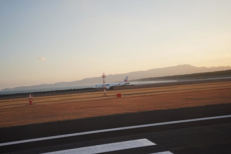 ソラシドエアに続いてJALの飛行機が飛んでいきます。夕暮れでモヤがかかり、神秘的な光景にも見える……なんてちょっと言いすぎかな。