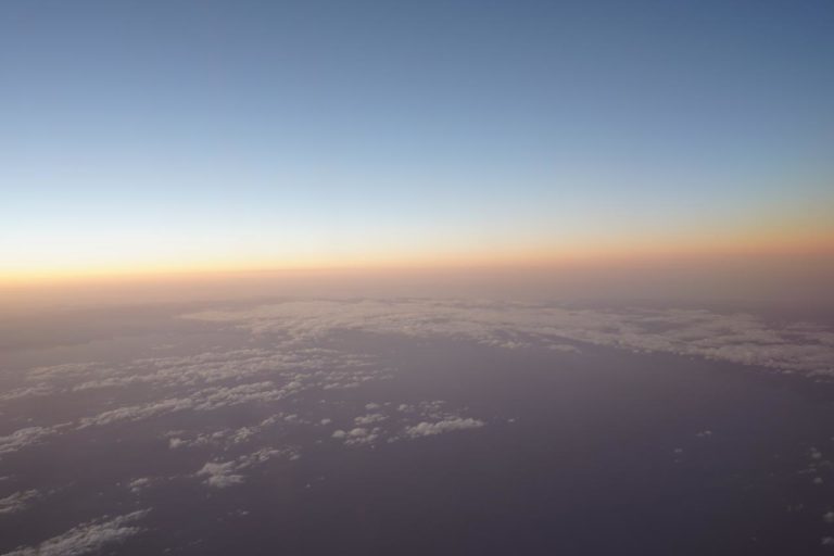 夕暮れで遠目に夕焼けを見ながら、丸い大地を見下ろします。飛行機で高度が高い場所から見ると「地球は丸かった」というのを実感できます。