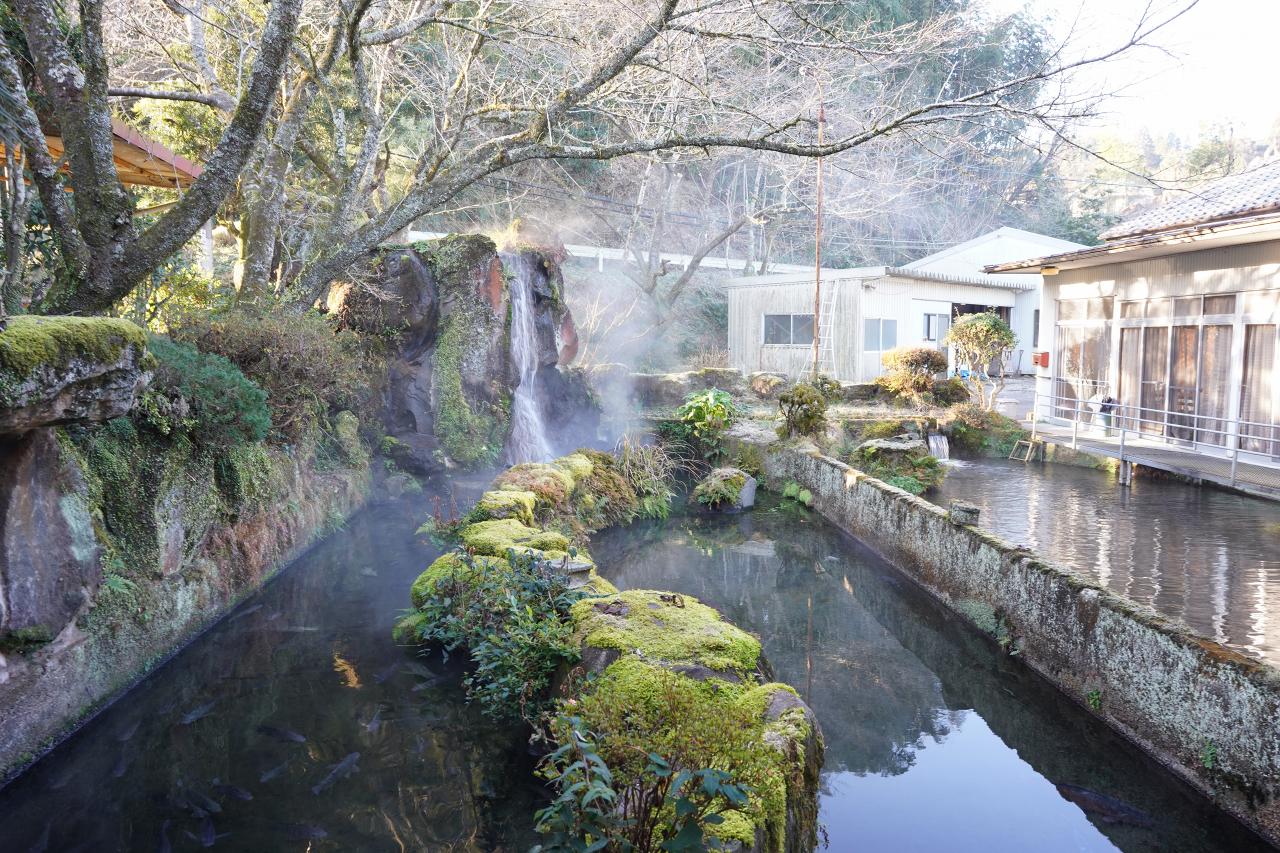 食事を食べる部屋からは大きな池のある中庭を眺めることができます。湯気が立っているけども温泉が流れているわけではなく、地下水と気温の温度差で湯気が立ち上ってるんだとか。寒い日に息をはくと白くなるのと同じ現象かな。