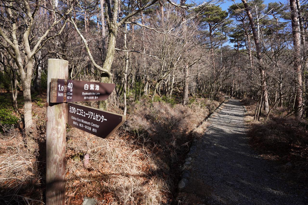 アスファルト舗装で歩きやすかったえびの高原展望台とは異なり、二湖展望台への道は急に砂利に。距離も1キロほどと長く、所要時間も掛かりそう。あんまり余裕時間はないけど、行けるところまで行ってみよう。