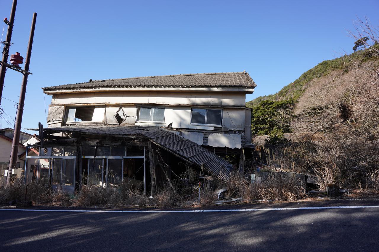 お店だったのでしょうか、二階建ての建物が半壊状態で残っていたり。こういうのって強めの地震とか来たら全部崩れそうで怖い。とはいえ鬼怒川温泉を見てしまっているとたいしたことないようにも見えるんだけど。