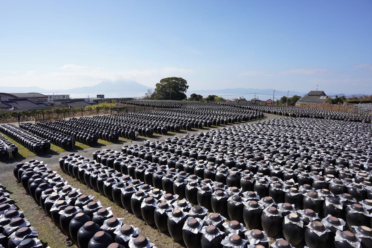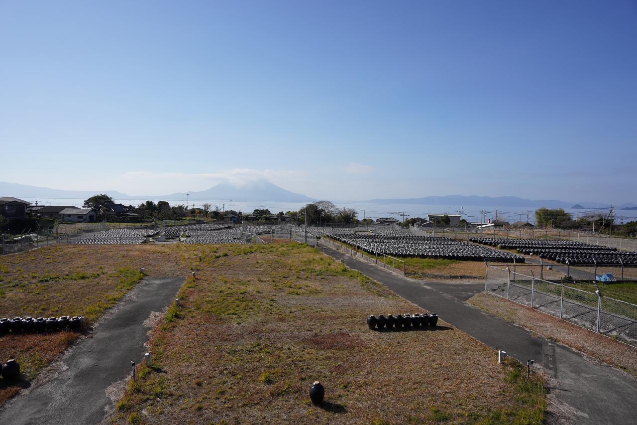 桜島に行くのは無理と判断したけど、眺めるくらいはしたいと思ってきたのが「鉄道記念公園(小廻中央公園)」です。この公園からは遠目に桜島を眺めることができる他、名産品の黒酢を作っている壺が並ぶ光景を見ることができます。