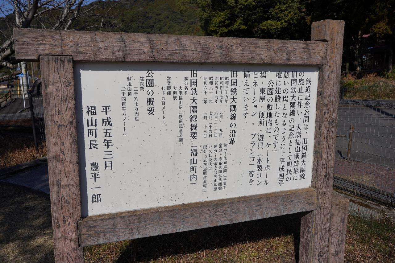 この公園は「鉄道記念公園」という名前ですが、由来はここが昔は駅だったから。昭和62年に廃止された志布志から国分までを結んでいた鉄道路線「国鉄大隅線」の大隅福山駅があった場所に作られた公園です。