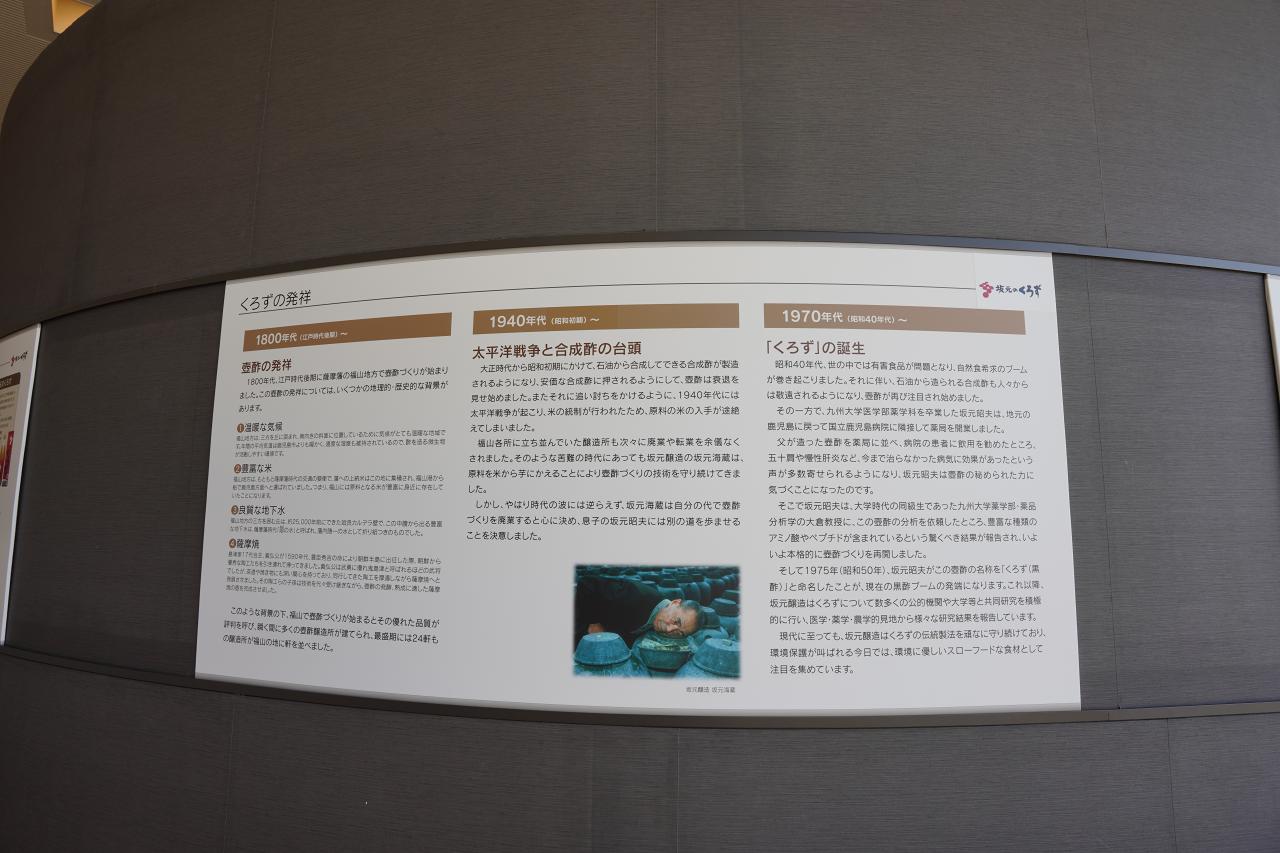 売店の裏手には黒酢発祥の紹介がされており、戦時中は米が使えずに芋で代用した話など、壺を使ったお酢づくりの歴史などを知ることができます。そもそも今となってはメジャーとなった「くろず(黒酢)」という名前は、ここ坂元醸造が名付けたんだとか。
