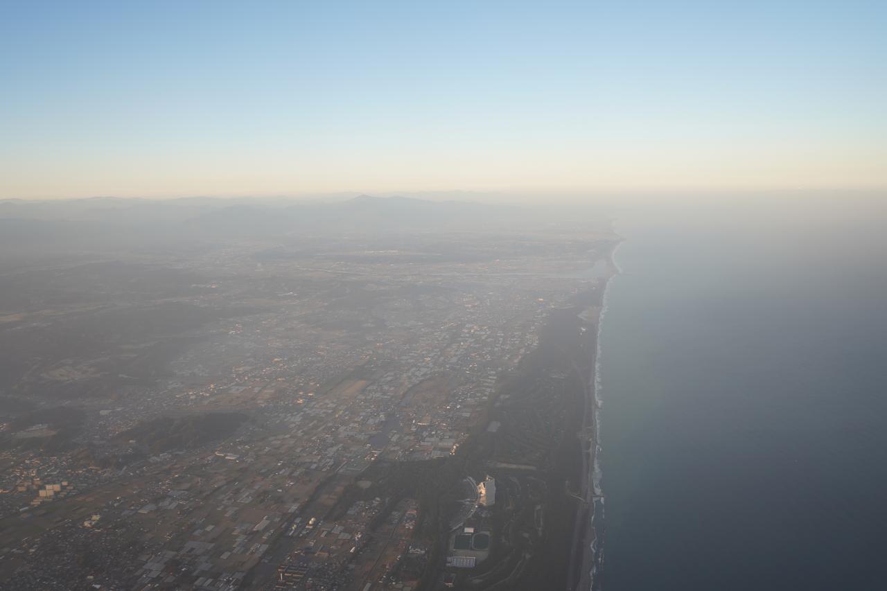 ソラシドエアに続いてJALの飛行機が飛んでいきます。夕暮れでモヤがかかり、神秘的な光景にも見える……なんてちょっと言いすぎかな。
