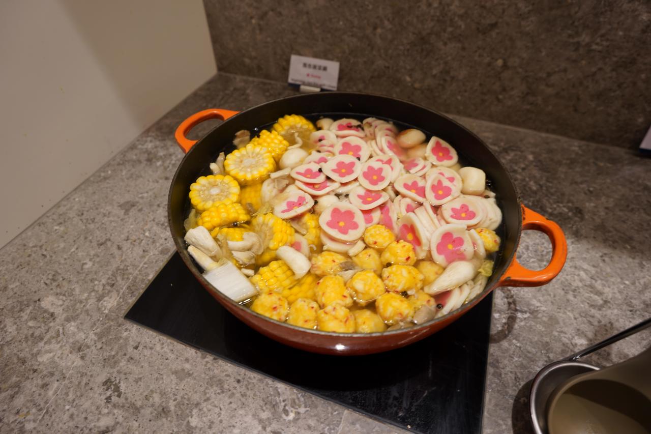 とうもろこしとナルトっぽい食べ物の煮込み料理。おもしろい見た目です。
