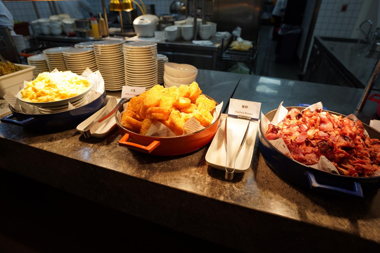 ベーコンにハッシュドポテトにポテトサラダ風の食べ物。この先でも食べる予定があるので、あんまり食べたい!と思わないものはスルーしておきます。