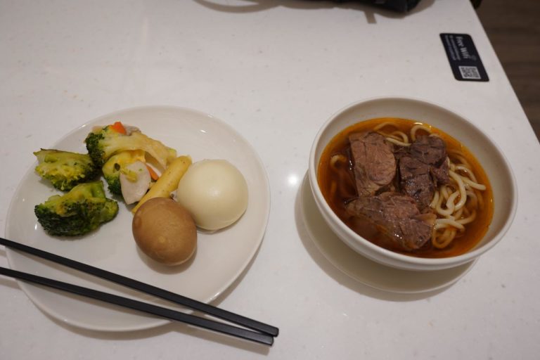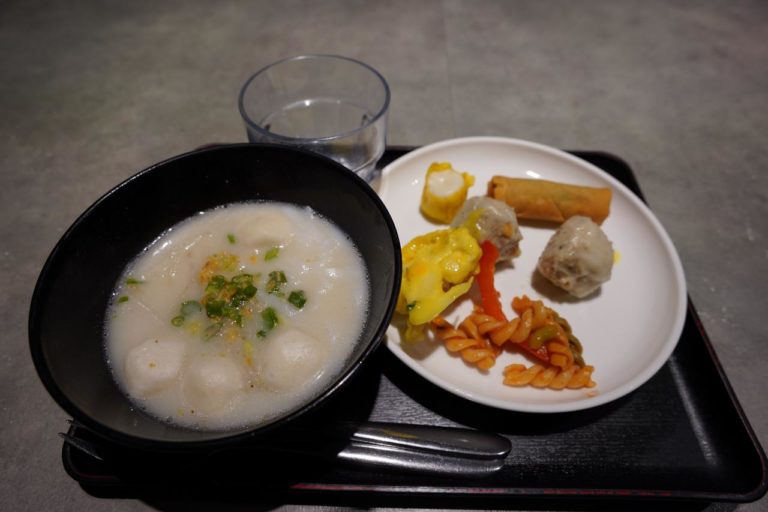 もらってきた料理がこちら。左側のは海鮮団子入りのフォーで、香港でポピュラーな麺料理なんだとか。料理は美味しいんだけど混んでて落ち着かないので、少し離れたラウンジに移動しましょう。
