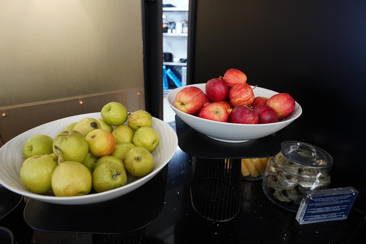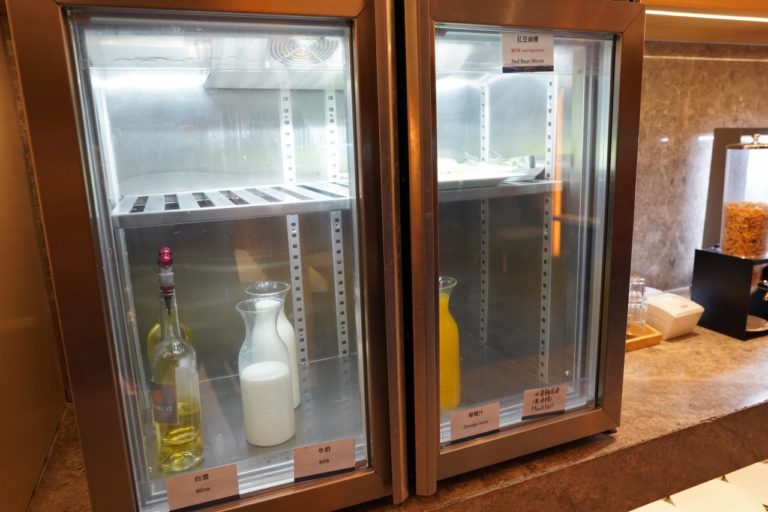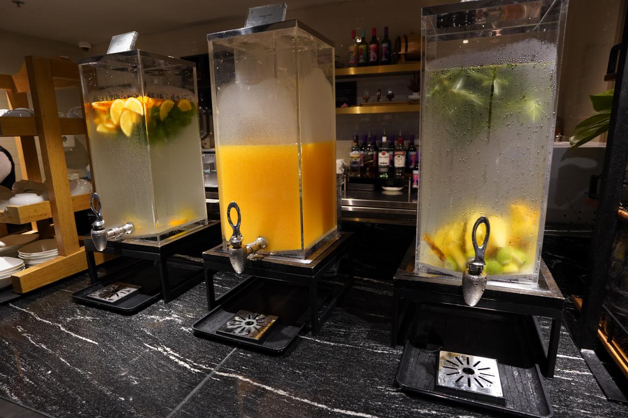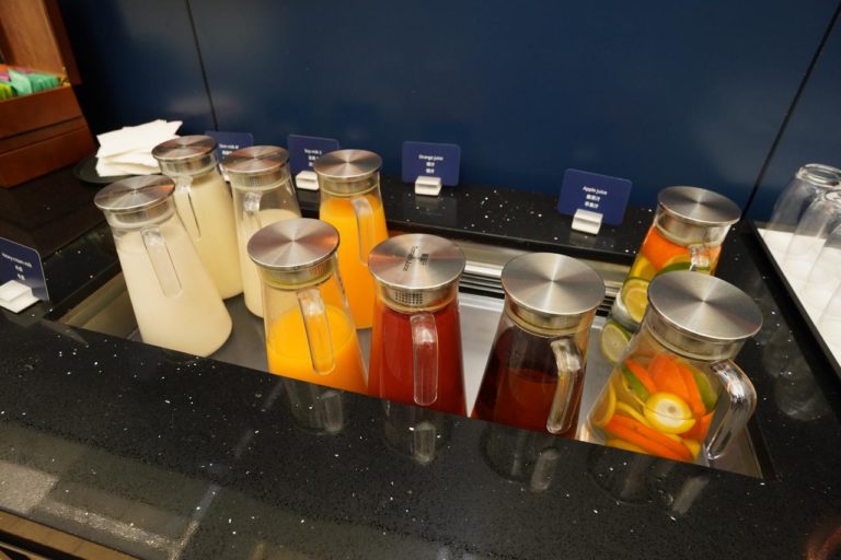 ドリンクコーナー。健康志向っぽいドリンクとオレンジジュース、コーヒーなどが用意されています。アルコールも頼むことができ、その場合はスタッフに頼んで入れてもらう仕組みのようです。
