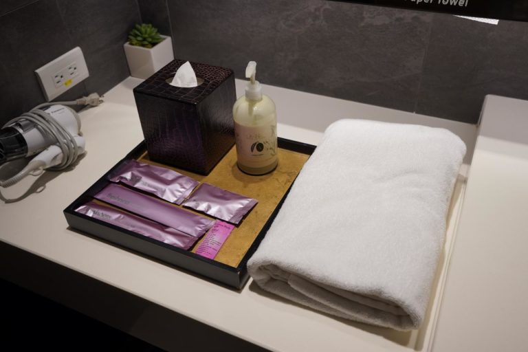 シャワーに必要なアメニティは一通り揃っており、バスタオルも無料で提供されます。シャワーを浴びたいならばこのラウンジがオススメ。