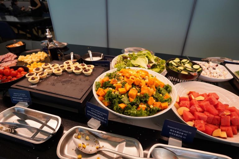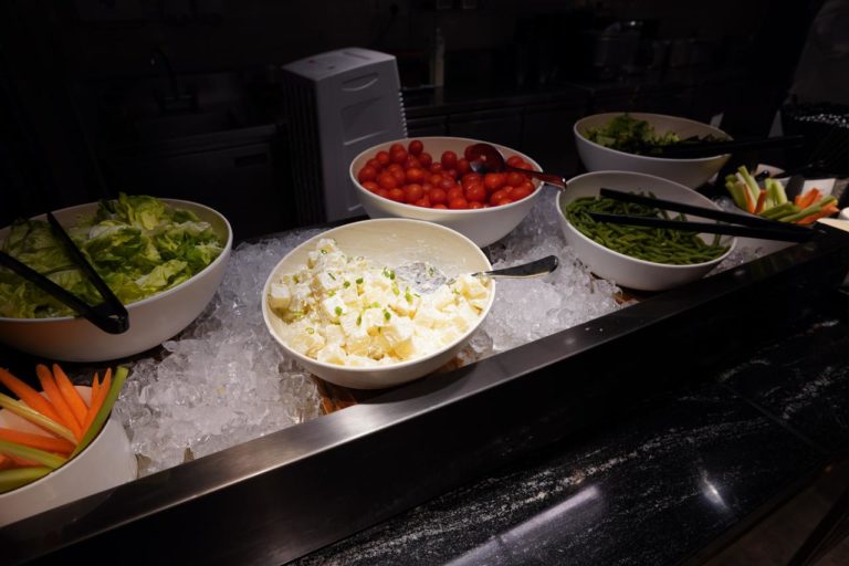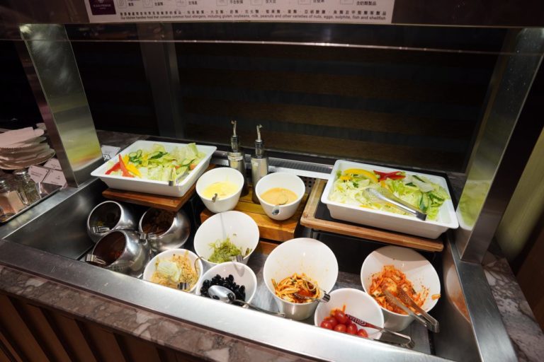 このラウンジで提供される軽食の紹介。まずはレタスやトマトなどのサラダ系です。旅行中には野菜不足になりがちなので嬉しいですよね。