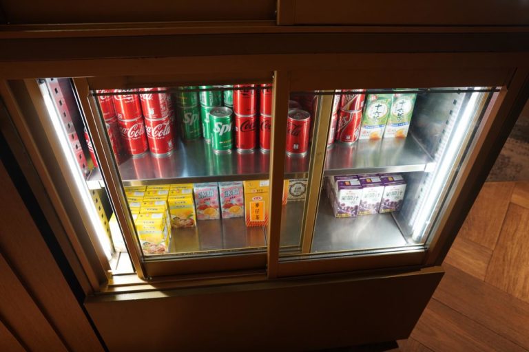 ドリンクコーナー。炭酸やお茶の缶やパックが置かれています。その他にもコーヒーや台湾ビールも提供されていました。