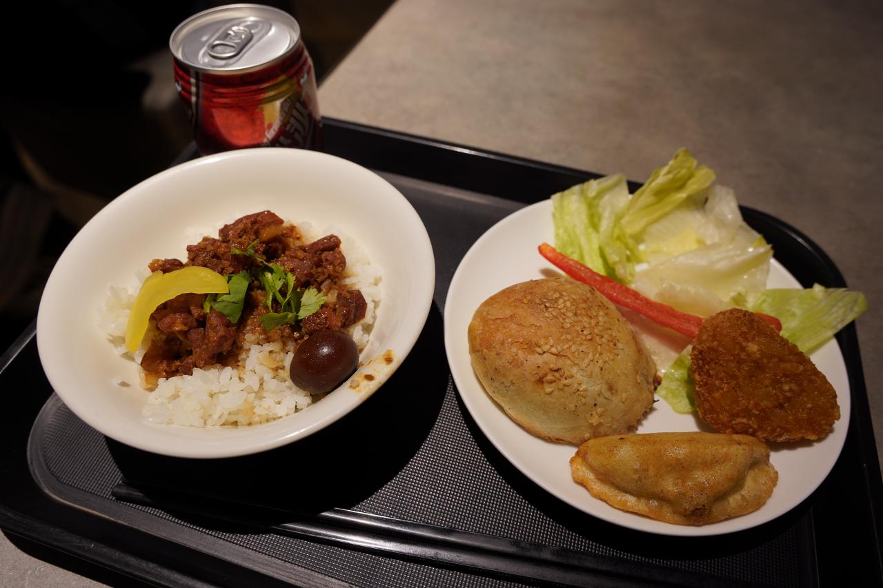 ご飯や肉団子、カリフラワーにパスタなどが並んでいます。中華料理とイタリアンが混じってるようなラインナップです。なお違うところにトーストもおいてありました。