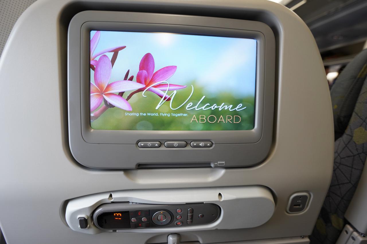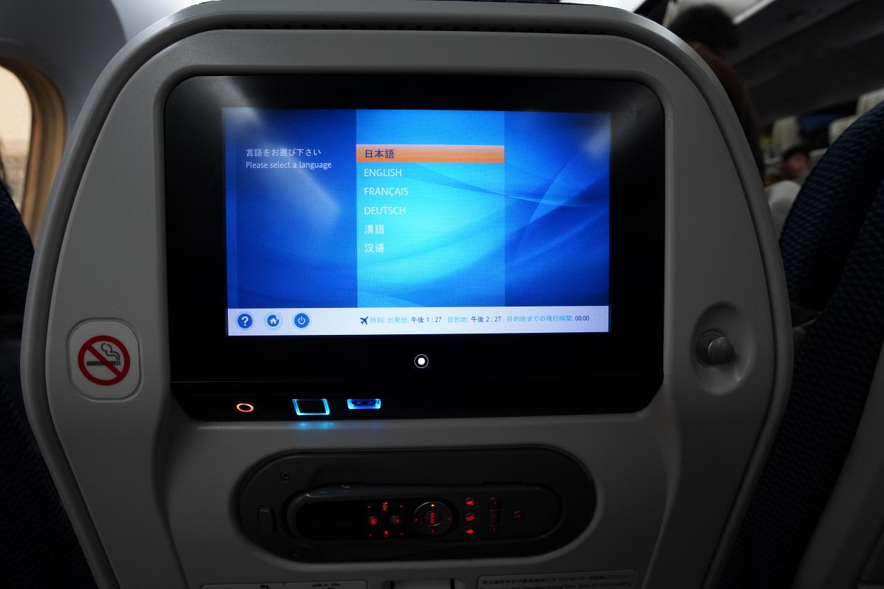 座席の前にはディスプレイとUSB-Aの充電ポート。あまり充電速度は早くないけど、差し込んておけば減ることがないだけでもありがたい。
