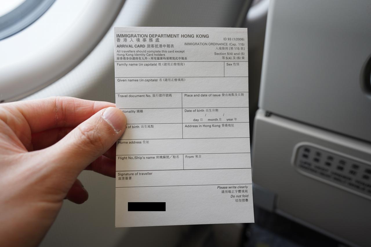 機内で香港の入国審査カードを記入。こういうのって現地着いてから書くと面倒なので、予め書いておけると現地での所要時間が増えて助かる。