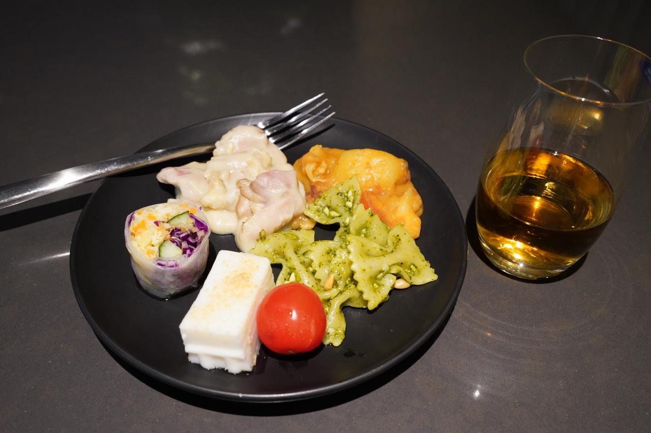 持ってきた料理がこちら。奥の缶はルートビアで、沖縄とかのより刺激が弱めなので飲みやすいと思います。軽食といいつつもガッツリ食べられるので、食事はラウンジで食べることにして行くのも十分アリ。