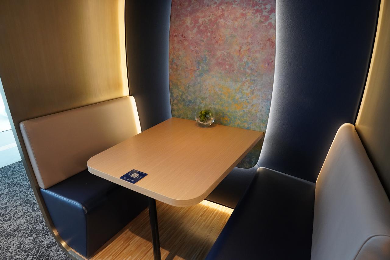 個室風のブースもあり、ちょっとしたレストラン気分も味わえます。もちろんコンセントは座席に備え付けられているので、滞在中に充電も可能。変換コネクタがなくても日本のコンセントが差し込めるタイプが用意されていました。