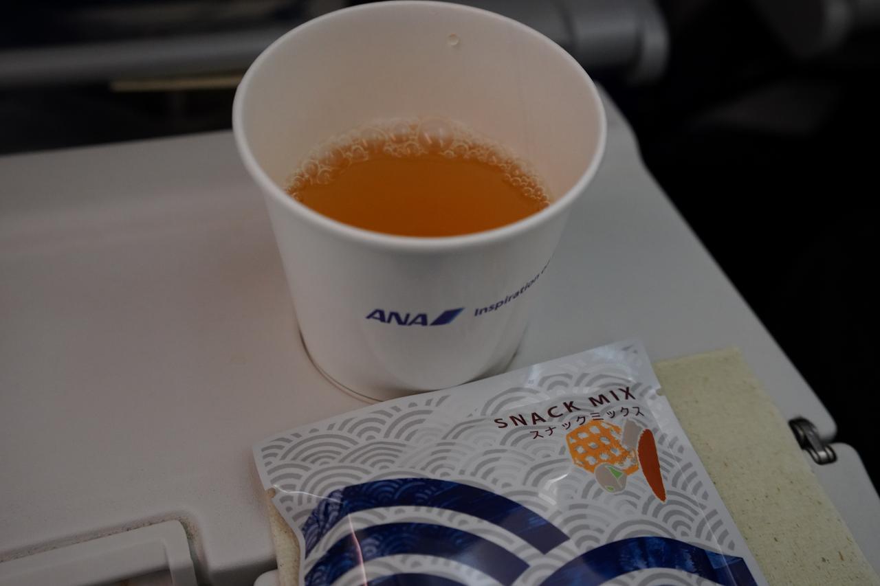 離陸してしばらくするとミックスナッツと共にドリンクサービス。国際線で時間もあるので何度もドリンクサービスが回ってくるので頼みやすい。