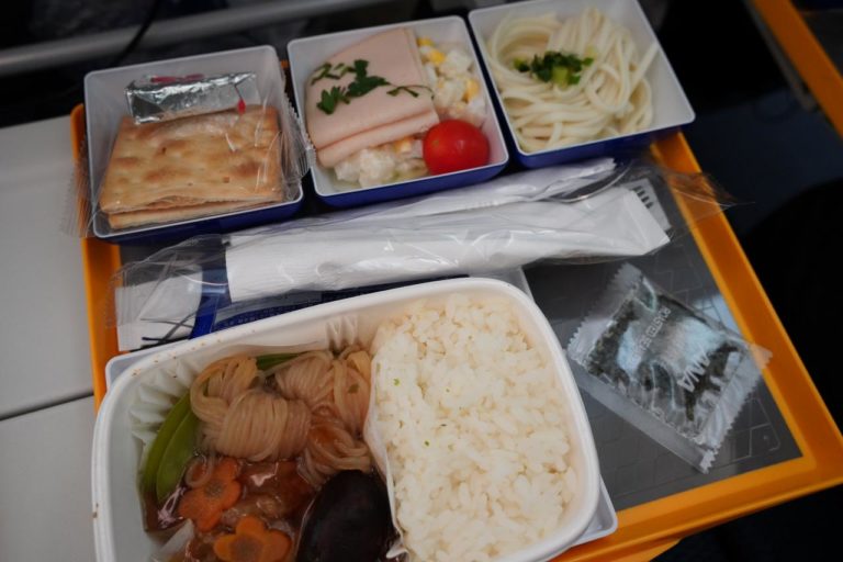 こちらが機内食。牛すき煮かチキンカチャトーラから選ぶことができ、牛すき煮を選択。セットにはクラッカーやサラダ、うどんなど品数豊富で満足できる機内食です。路線によってメニューは異なるから食べ比べてみたくなっちゃう。