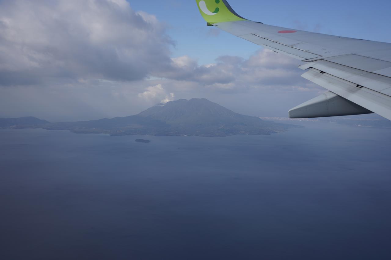機内でAmazonプライムビデオを見たりして過ごしているといつの間にか鹿児島県に到着。左手に桜島が見えるけど、若干噴火してる?これだと近くまで行けなかったりするのかな。