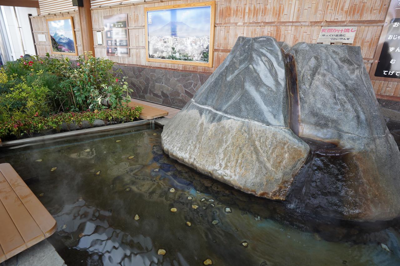 レンタカー屋に電話して送迎場所に向かう途中に足湯を発見。ポカポカして暖かそうです。