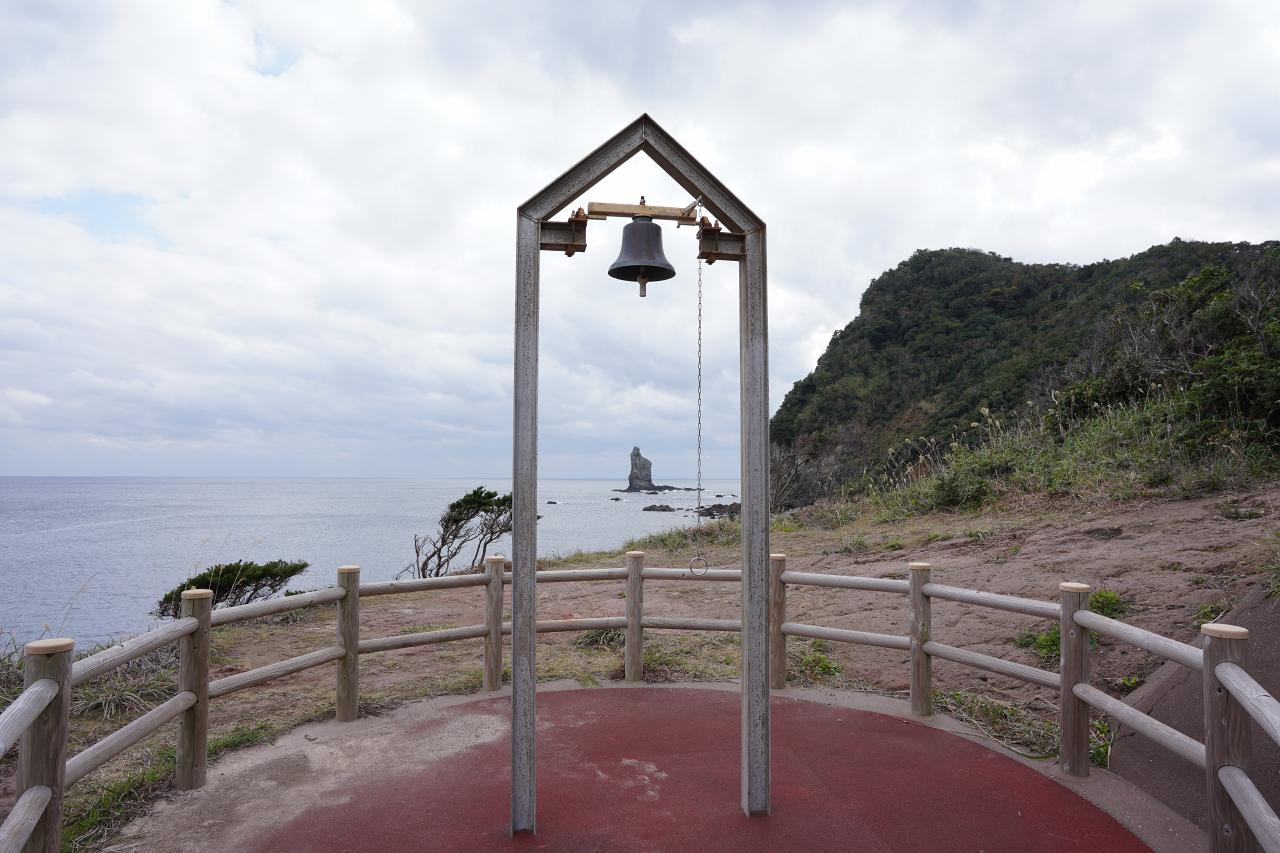 少し離れた場所にある幸せの鐘。中央から立神岩を見ながら鳴らしつつ幸せを願います。良いことあれば良いな。