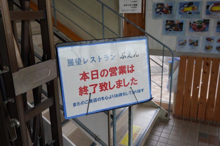そして2階のレストランに向かおうと奥に行くと、もう営業終了したという掲示が。そりゃもう14時半過ぎだしやってないよね。火之神公園に行く前に来ておけばワンチャン可能性あったかもしれないけど。