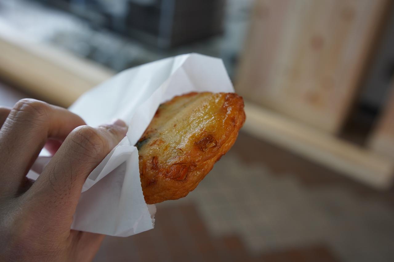 仕方がないのでさつま揚げ(200円)を購入してモグモグ。揚げたてで結構分厚いので食べ応えあります。