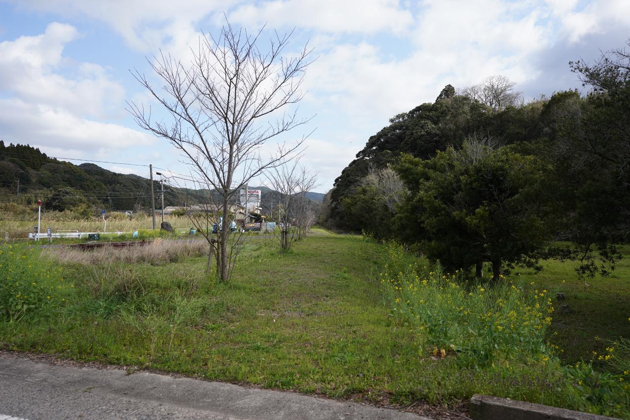 なんか怪しい。木の生えている場所も中途半端だし、列車が通れそうな幅が先に続いています。気になって調べてみると、ここには以前「鹿児島交通枕崎線」という鉄道が走っておりその廃線跡なのだとか。枕崎駅から鹿児島本線の伊集院駅までを結んでいたものの、赤字や災害の影響によって1984年に全線廃止となった路線です。ちなみに枕崎駅の開業は国鉄側が後で、先に出来た路線が消えて後から出来た路線が残るというのは何とも言えません(指宿枕崎線も怪しいけど)。