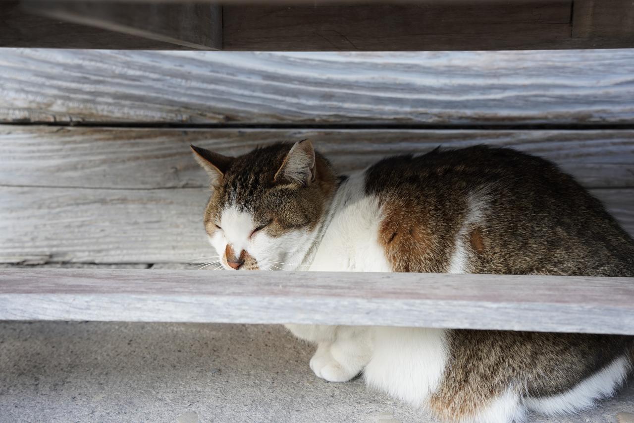 駅舎の手前にあるベンチの下ではネコがスヤスヤ。人に慣れているようで、近づいても逃げるそぶりもありませんでした。