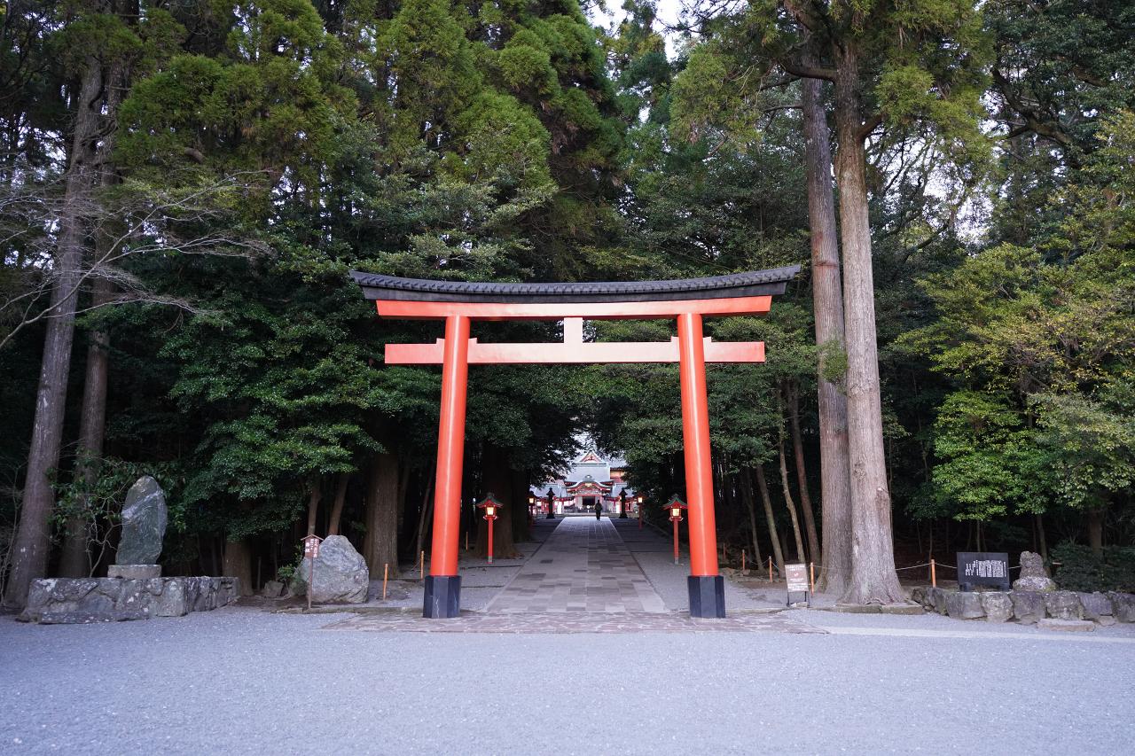 本日泊まる宿は霧島神宮に近い民宿。あんまり位置関係を確認していなかったのだけど、ナビに従っていくと霧島神宮の大鳥居をくぐって行けと。もう目の前が霧島神宮なんだけど……?