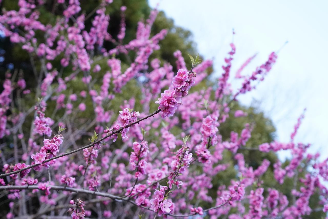 帰り道に境内に咲いていた花。これは桜なのかな。色が濃い目できれい。