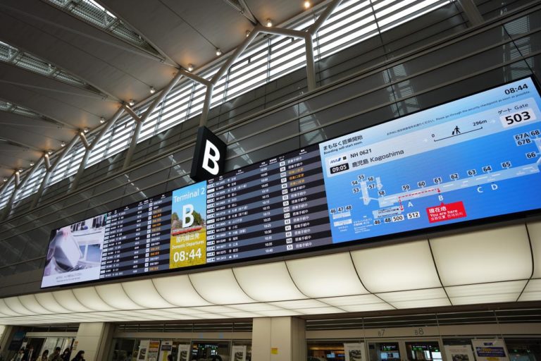 羽田空港に到着。以前大きなモニターが撤去されたと話題になっていた搭乗口「B」には、新たに大きなモニターが設置されていました。やっぱり大きなモニターがある方が空港という雰囲気を楽しめます。というか撤去されたのも単純に置き換えるためだけだったのかもしれない。