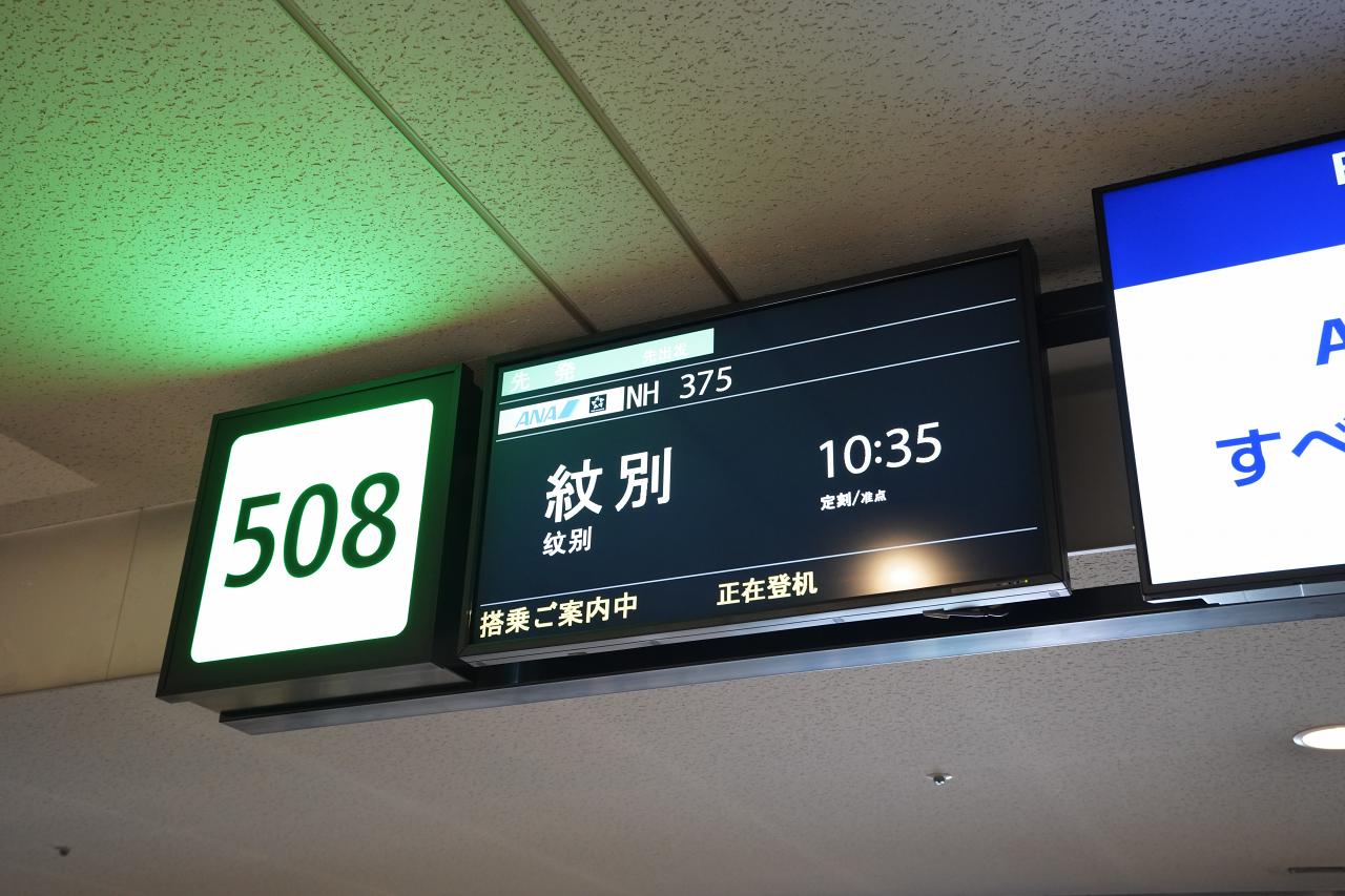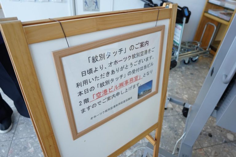 到着口を出ると、「『紋別タッチ』のご案内」という立て看板。紋別タッチというのは羽田空港から紋別空港に着いて、そのまま折り返しの便で羽田空港に帰ることを言います。要はANAのプレミアムポイント稼ぎの修行ですね。個人的にはホタテくらい食べて行けばいいのにと思ってしまう。