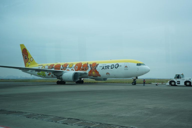 バスに乗って飛行機に向かう途中、AIRDOのロコンジェットが横に。ソラシドエアのナッシージェットみたいでかわいい。