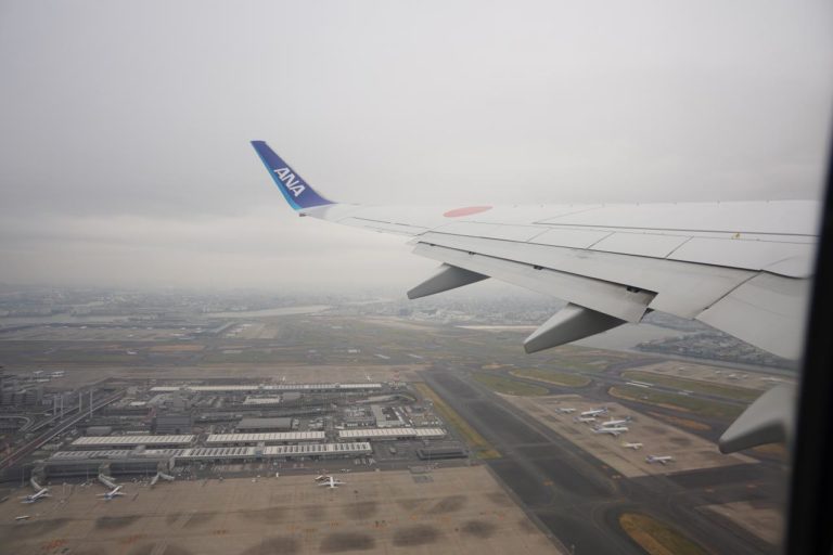 曇っている羽田空港から離陸。富士山とかは見られなくて残念でしたが、現地で晴れているほうがよっぽど助かります。