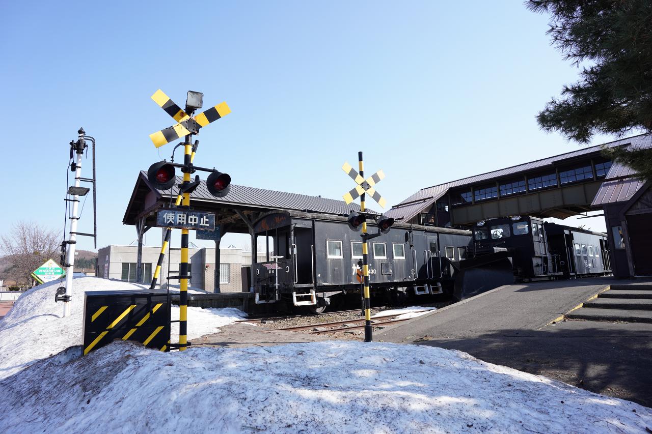 駅跡にはホームや跨線橋が保存されていて、営業当時の痕跡が残されています。残されている使用中止と書かれた踏切が悲壮感を感じます。