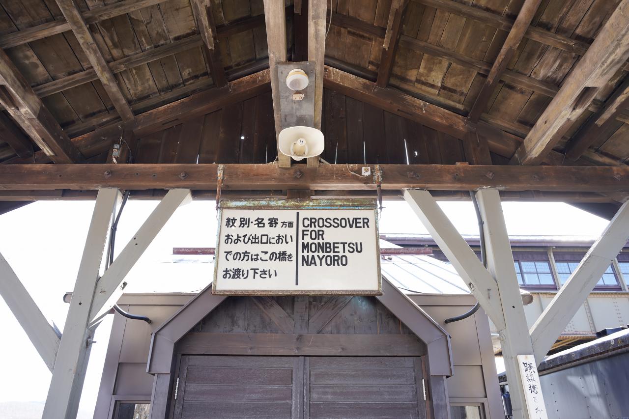 跨線橋の手前には「紋別・名寄方面および出口においでの方はこの橋をお渡り下さい」と記載があることから、このホームは湧網線のホームのようです。運行当時に来て見たかったですね。