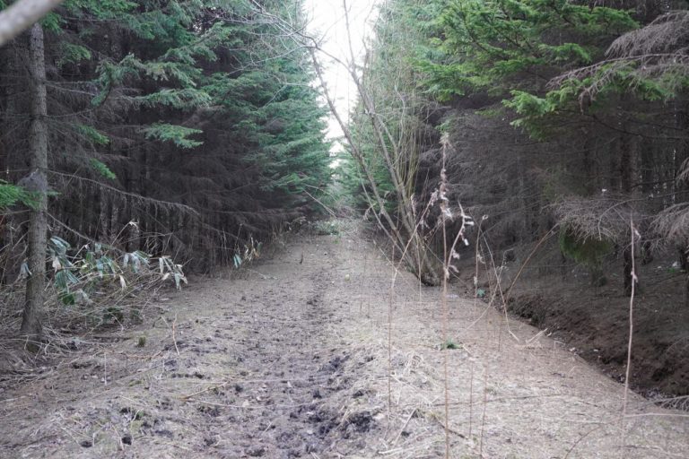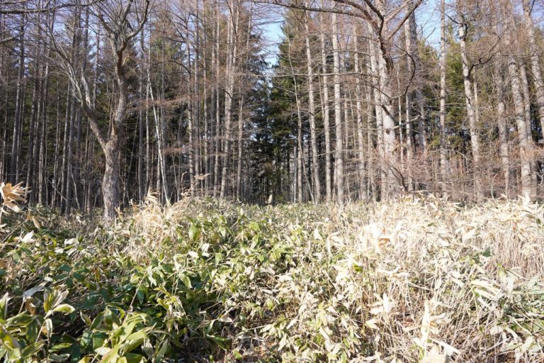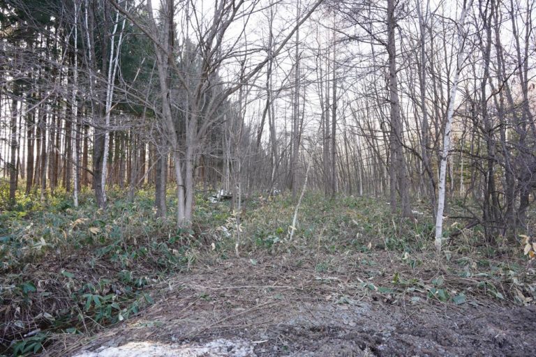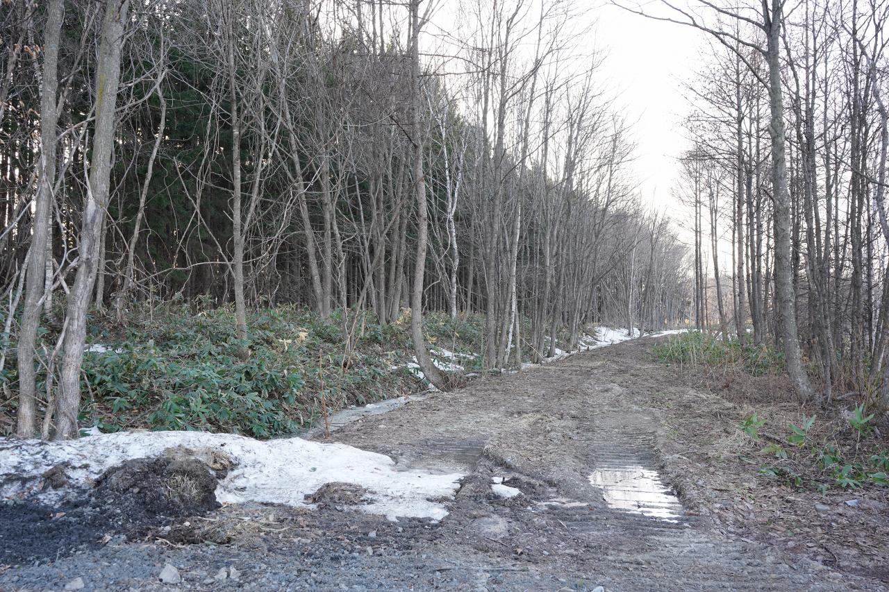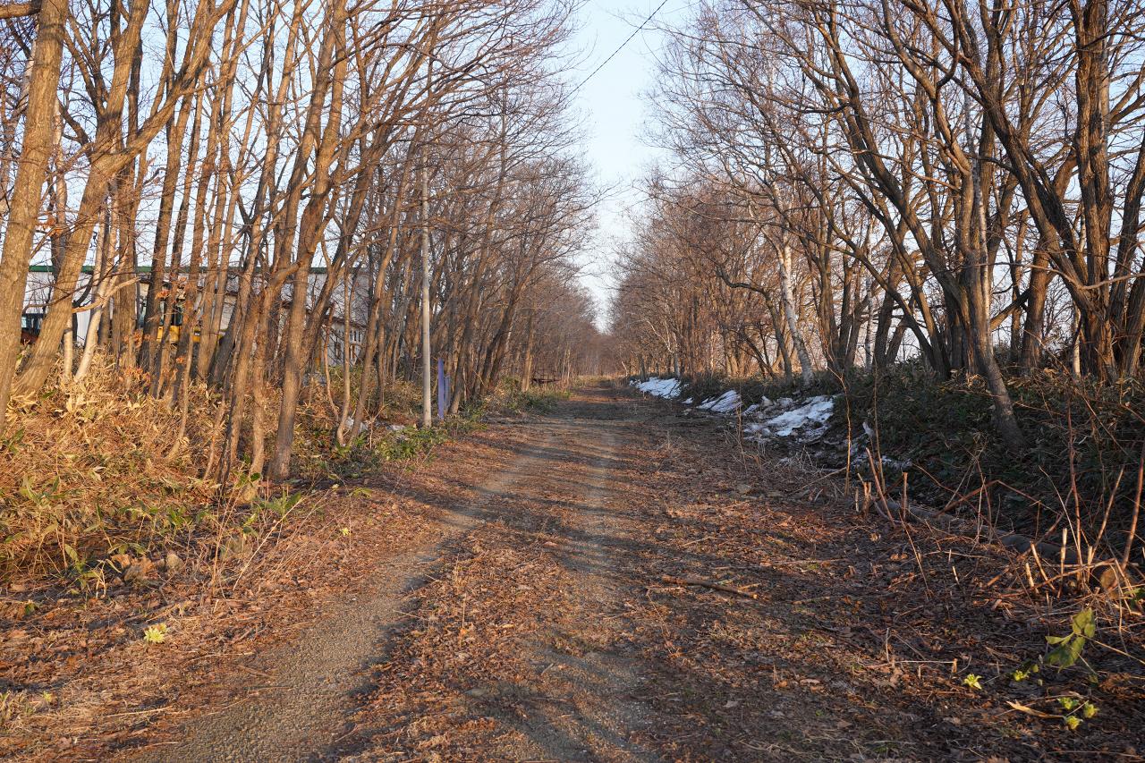 少し遠軽側に戻ったところに廃線跡が未舗装の道路になっている場所があります。オフロードなどを走れるような車であれば突撃しても良いとは思いますが、一般の車だとやめておいた方が良さそうな雰囲気です。少し歩いて痕跡が無いか見てみたけども、それっぽいものはなにもありませんでした。