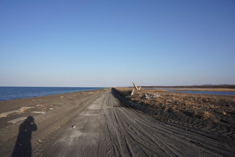 コムケ湖とオホーツク海の間は細い砂道が続いていて、車で通ることも可能。でもそこまでめちゃくちゃ景色がいいわけではないし、砂でタイヤを取られる可能性もあるので戻った方が無難かもしれない。