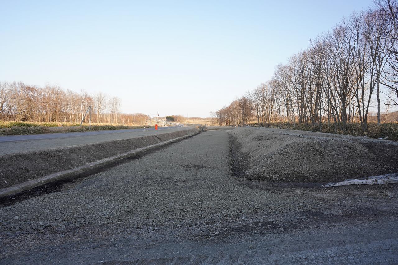 しかしこの痕跡が見られるのも、あとわずかかもしれません。というのもすぐ裏までは道路工事が進められており、きれいに整えられてしまっています。廃止前に乗りに行くというように、痕跡が消える前に見に来ることをおすすめ。